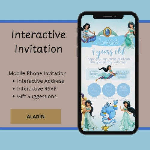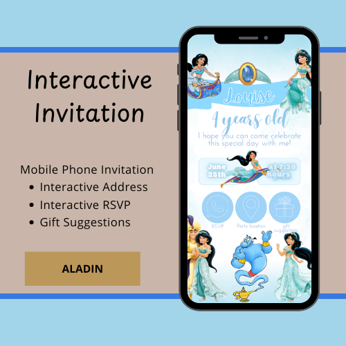 Take your guests on a magic carpet ride with our Aladdin Interactive Editable Video Invitation! Inspired by the beloved tale of adventure, romance, and magic, this dazzling video invite features desert skies, golden palaces, and iconic elements like magic lamps and flying carpets—perfect for a royal celebration!