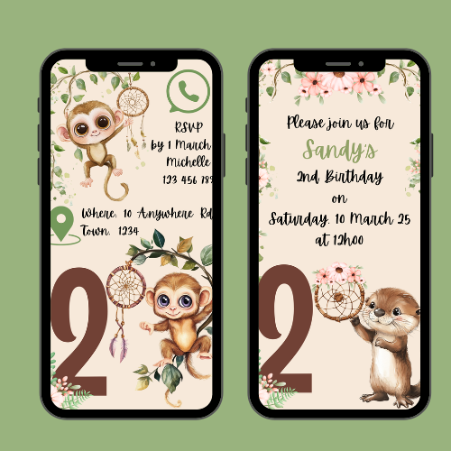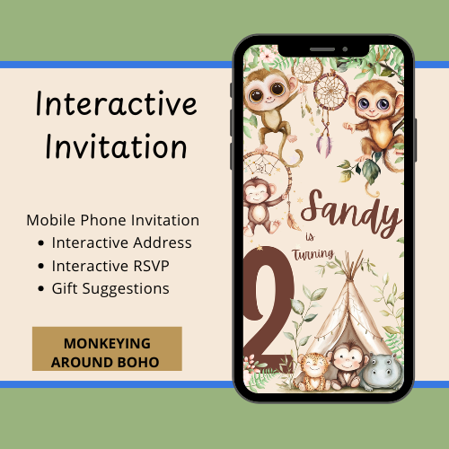 Let’s go wild in style! Our Monkeying Around BOHO Interactive Editable Video Invitation blends jungle fun with earthy boho tones—featuring adorable monkeys, soft neutrals, dried leaves, rainbows, and subtle animations that create a warm, playful vibe. Perfect for modern mamas planning a trendy jungle bash!