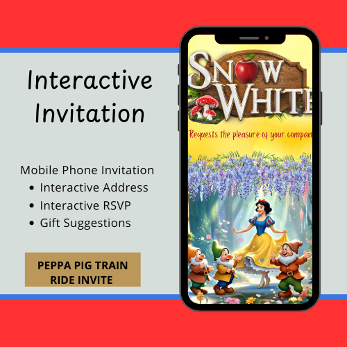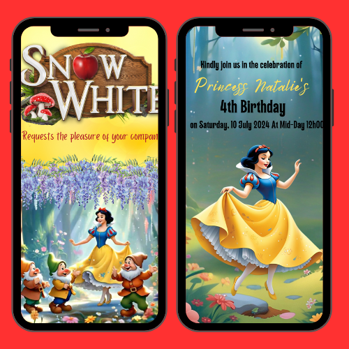 Step into a storybook celebration with our Snow White and the Seven Dwarfs Interactive Editable Video Invitation! Featuring enchanting forest scenes, sweet animations of Snow White and her lovable dwarf friends, and magical music, this whimsical invite is perfect for your little princess’s fairy tale birthday or themed event.