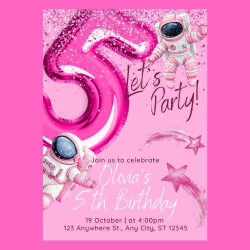 Blast off into a universe of fun with our Space Astronaut Girl Editable Invitation! Featuring a brave little girl astronaut exploring planets, stars, and rockets in a dreamy pastel galaxy, this invitation is perfect for any space-loving explorer ready to celebrate among the stars.
