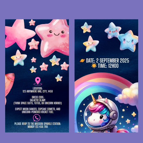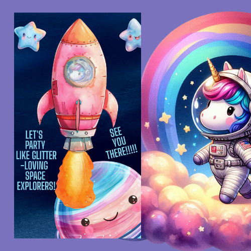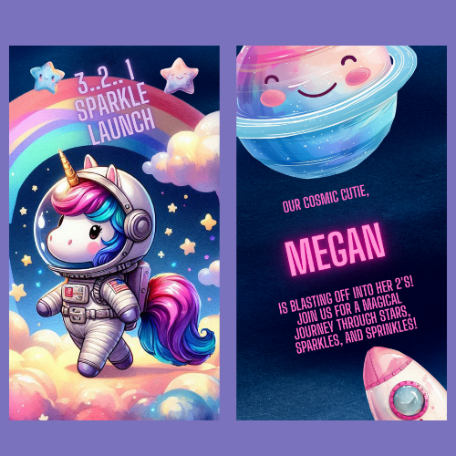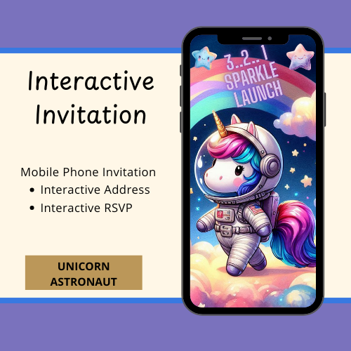 Blast off into a galaxy of glitter and magic with our Unicorn Space Interactive Video Invitation! Perfect for birthday parties and cosmic celebrations, this one-of-a-kind digital invite combines sparkling unicorns with a whimsical outer space theme for a magical experience that's out of this world.